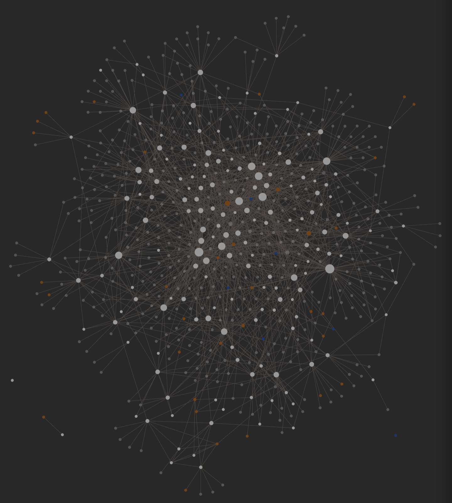 Every bright dot is a note, every dark gray dot is a link that is created, but the page hasn’t be created yet, and the other colors (brow and blue) are tags and files.